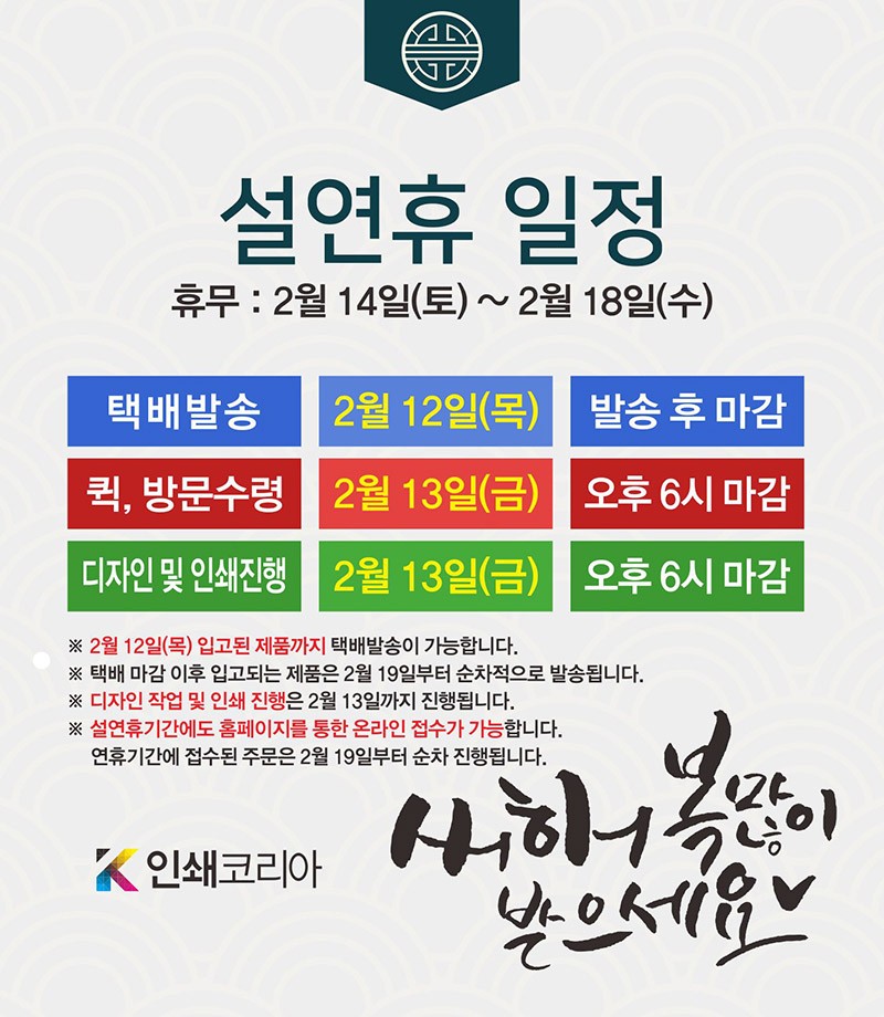 주문제작 특성상 입금확인 후 디자인 및 인쇄가 진행됩니다.